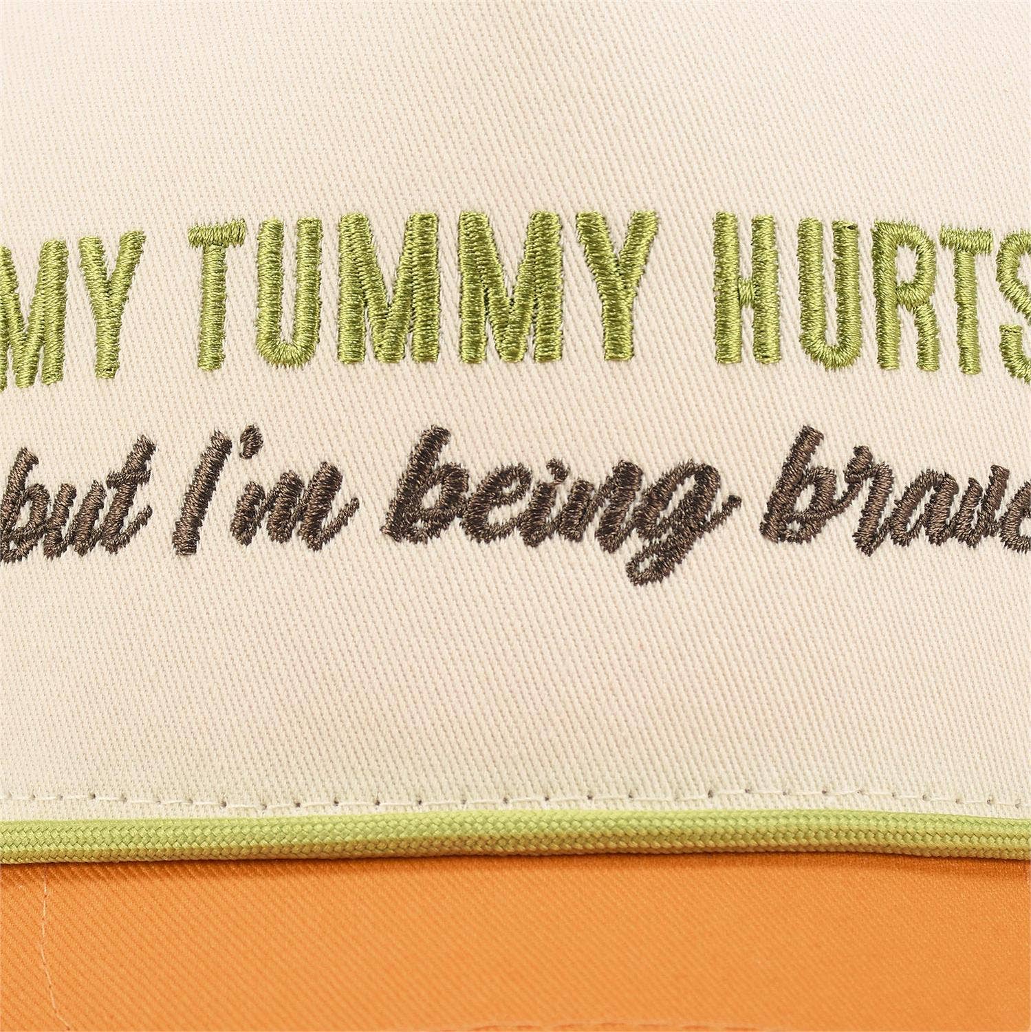 Get your much needed praise and encouragement with this trucker hat displaying a relatable sentiment that reads "My Tummy Hurts But I'm Being Brave" in an earthy style. This down-to-earth design is embroidered on cream cotton for eye-catching dimension with a coordinating green cording accent and orange color throughout. Questionables trucker hats are one size fits most with an adjustable snap closure to create the perfect fit and feature a full mesh back for comfort and breathability in hot weather. Hand wash only. Our Being Brave trucker hat puts out chill vibes making it perfect for everyday expression.