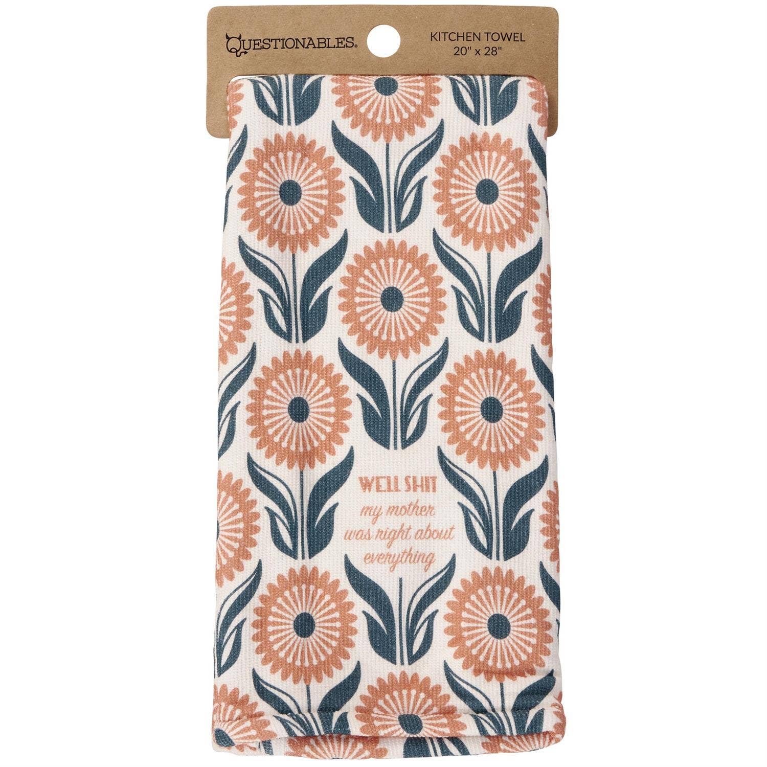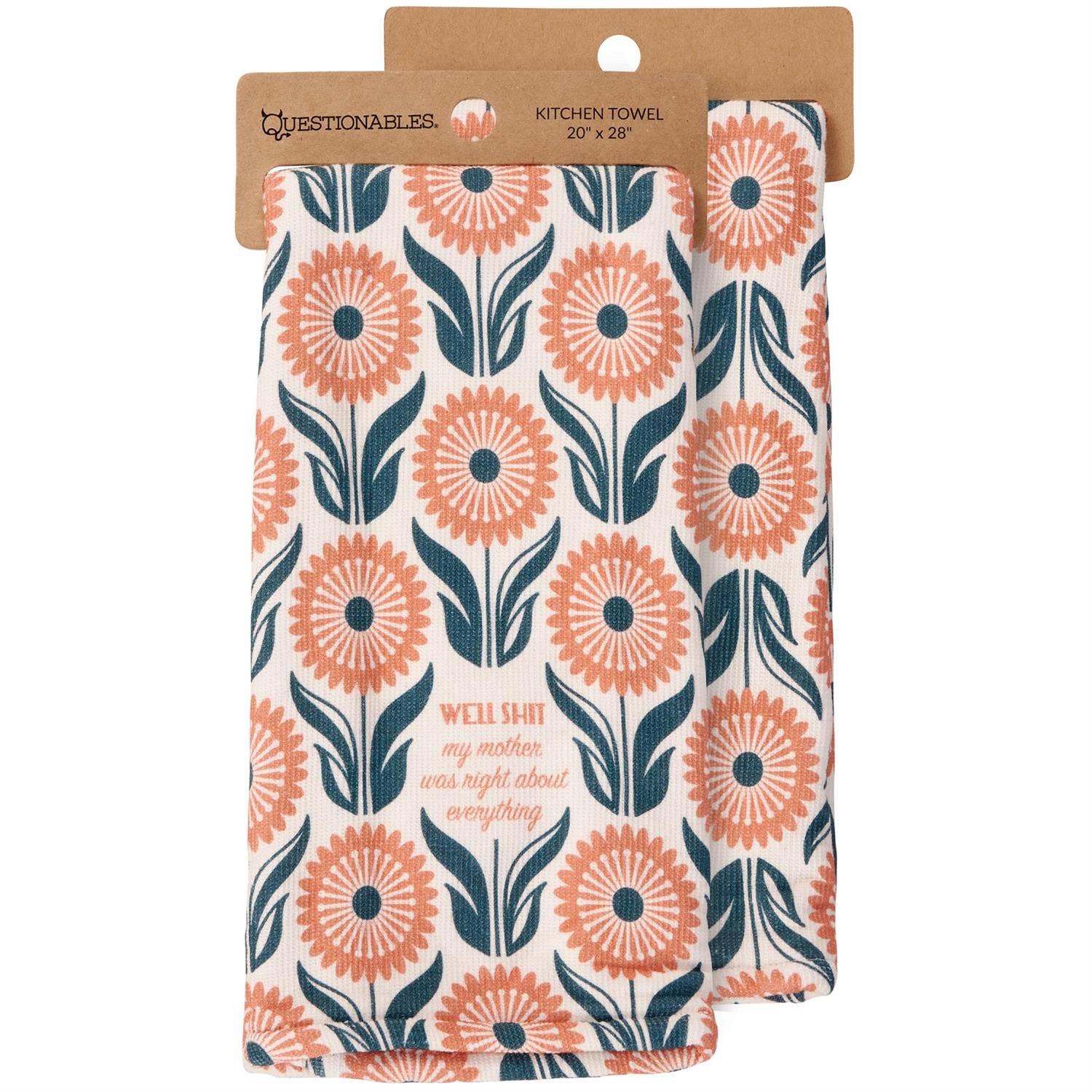This super-soft cotton kitchen towel flaunts a stylish floral pattern with a sassy sentiment that reads "Well Shit - My Mother Was Right About Everything." Fold to display the flower pattern for when you want to hide that realization from mom or flip to display the relatable sentiment for everyone else. This kitchen towel features an absorbent terrycloth layer on the back to soak up whatever you throw at it. Machine-washable for stress-free cleaning.